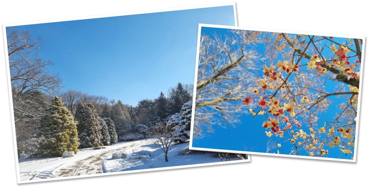참! 다들 새 눈 선물하기는 성공하셨을까요? 저는 지난주에 첫눈이 펑펑 내리자마자 눈뭉치를 냉동실에 넣어두고 잠들었어요. ‘히히 누구한테 선물할까~’하면서 말이에요. 유치하지만 장난을 받아줄 수 있는 친구가 있는 건 늘 감사한 일이에요. 아침에 눈뭉치를 신나게 선물하고는 수목원 곳곳을 쓸기 시작했어요. 빗자루로, 넉가래로, 눈삽으로 쓸면서 바라본 수목원은 눈부시게 아름다웠어요. 아스팔트 위에 내린 눈과 다르게 낙엽 위에 쌓인 눈은 밟는 소리부터 달라요. 뽀드득 아래 바사삭거리는 눈에 젖은 낙엽들의 이중주가 펼쳐져요. 지상에서는 새하얀 백설기 같은 눈송이 위로 콕콕 찍힌 각종 바람의 흔적과 발자국을 감상하고 아직 열매가 남아있는 참빗살나무의 분홍 모빌을 바라보며 멋진 하루를 보냈답니다. 실내로 돌아와서는 따뜻한 코코아 한잔으로 마무리했고요. 분명 눈 오는 날은 번거로워요. 출퇴근길에 버스는 설설 기어가고, 운전하는 분들은 각종 사고로 간밤에 골치를 썩인 분들도 많았어요. 넘어져서 병원에 가는 분들도 있고요. 그래도 여전히 아름다운 풍경인건 사실이니까요, 조심조심 다니면서 겨울날을 함께해요.