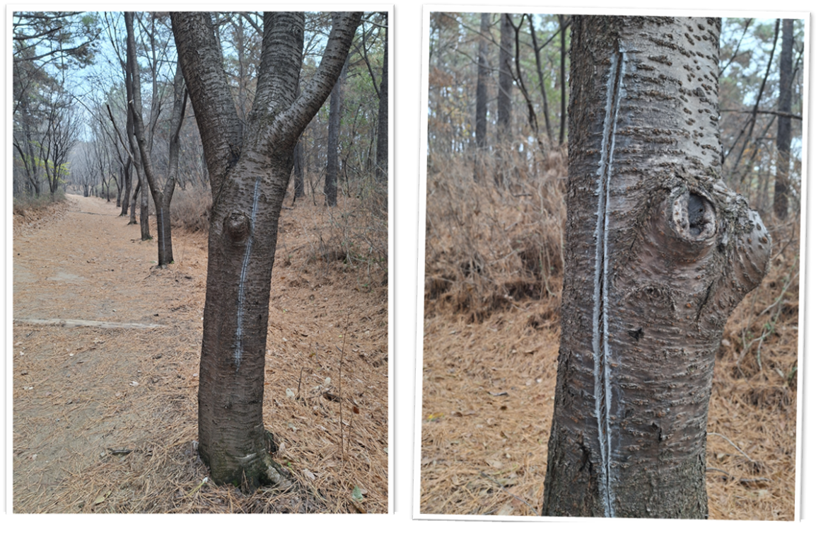 겨울은 우리가 초대한 식물을 세심하게 볼 수 있는 시기에요. 잎사귀나 열매 등 우리의 눈길을 끄는 화려한 요소들이 사라진 겨울에는 나무의 본질을 볼 수 있어요. 나무의 수형이 어떻게 나무의 종류마다 어떻게 다른지, 봄, 가을에 자른 나무가 어떤 모양을 하고 있는지, 나무 표면에 난 상처가 왜 있는 것인지 고민할 수 있어요. 최근 함께 출장을 다닌 식물 선생님께서 의문의 사진을 보여주셨어요. 일렬로 심긴 가로수에 칼로 베어낸 듯한 날카로운 상처가 있고, 회색의 물질이 상처에 발려있었고요. 나무를 죽이려는 시도라 하기에는 날카로운 자상을 하나씩 내는 게 수고스러워 보였고요. 하지만 이 상처가 나무에 절대 득이 되어 보이지는 않았어요. 나중에 알아내신 바로는 나무의 겨울나기를 돕기 위해 짚을 둘러주고, 나중에 제거할 때 칼로 깊숙이 벤 나머지 저렇게 상처가 난 것이었어요. 나중에 이 상처를 문제 제기하자 해당 기관에서 약을 바른 것이라고요.